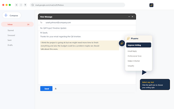 Denna skrivassistent är utformad för att fungera smidigt överallt på webben. Användare kan enkelt aktivera verktyget genom att välja text, använda en högerklicksmeny eller en snabbkommandotangent. Pluume gör det möjligt att skriva från grunden med en popup-funktion, vilket gör det till ett mångsidigt verktyg för både professionella och personliga skrivbehov.